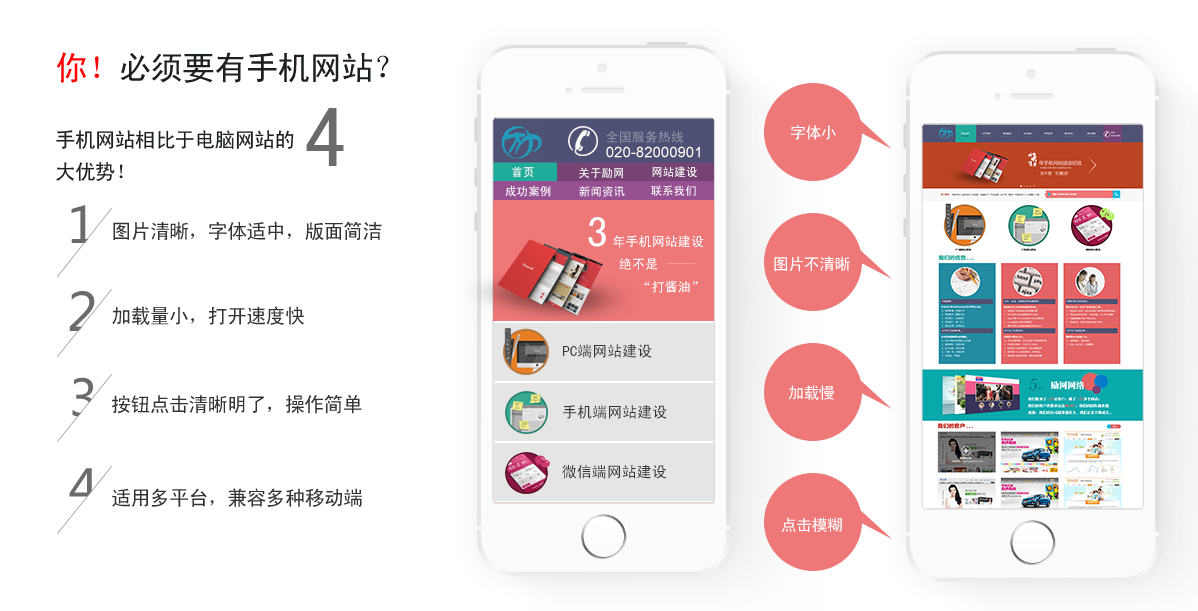 手機(jī)網(wǎng)站時(shí)代迅猛來襲,你OUT了?截至2014年底,手機(jī)網(wǎng)民數(shù)達(dá):6.3億網(wǎng)站流量有33%來自移動(dòng)互聯(lián)網(wǎng)并持續(xù)上升中56%的移動(dòng)互聯(lián)網(wǎng)網(wǎng)民每天上網(wǎng)1小時(shí)以上78%每天至少手機(jī)上網(wǎng)1次以上4G時(shí)代已經(jīng)來臨,智能大屏手機(jī)的發(fā)展,手機(jī)網(wǎng)站應(yīng)運(yùn)而生,發(fā)展迅猛。如果你現(xiàn)在還沒有手機(jī)網(wǎng)站,你已經(jīng)遠(yuǎn)遠(yuǎn)落后于競爭對(duì)手了